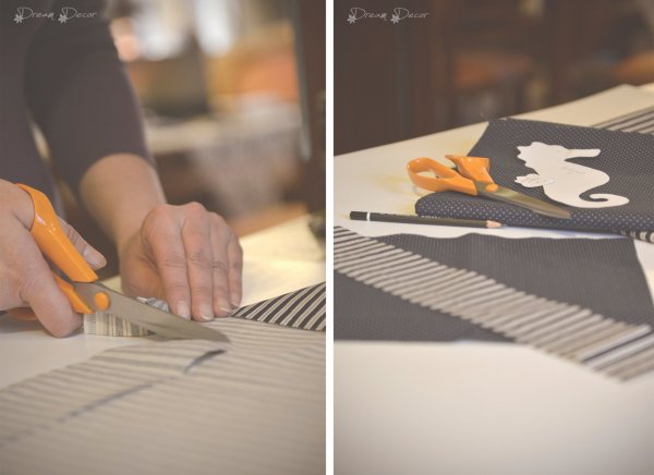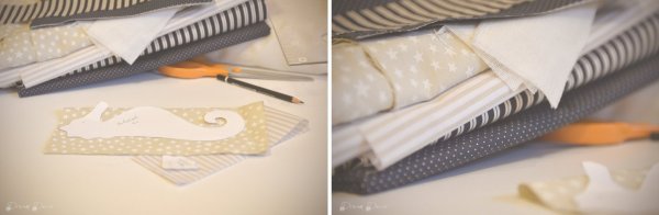Először is mindkét kelméből 2-3 cm-rel nagyobb téglalap alakú 2 darabot kiszabunk, mint a szabásminta. Szinével befelé mindegyiket egymásra helyezzük, és rárajzoljuk a kivágott mintát, a pici szárnyakból 2 darabra lesz szükségünk