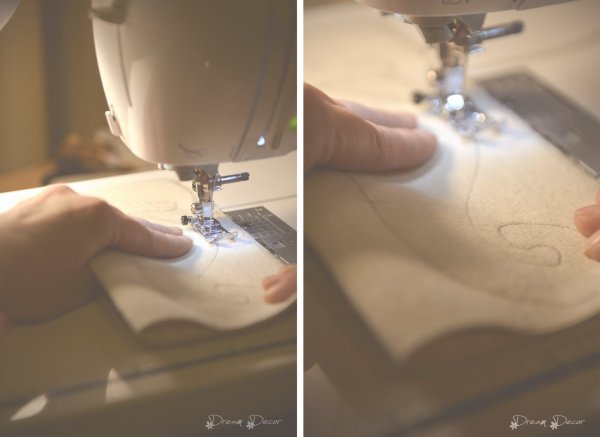 Mikor ezzel megvagyunk, a minta vonalát követve összevarrjuk, mindegyiken 3-4 cm kifordító nyílást hagyva.