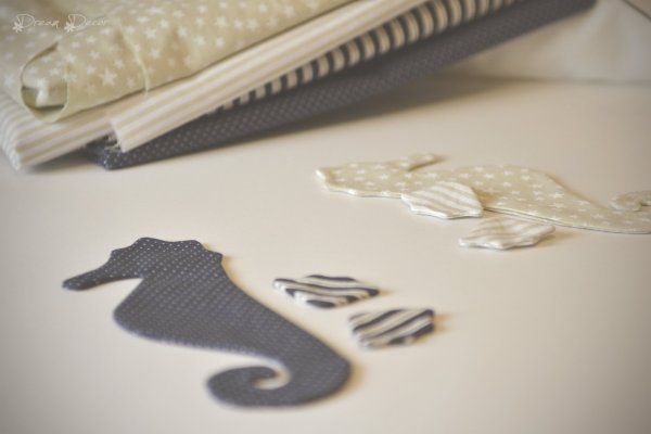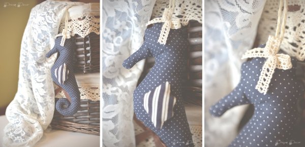 Az előző blogban egy fa tábla bemutatóját láthattátok, aminek most hozom a folytatását. Ezt a dekorációt a tenger ihlette, a színe, a nyugalma, és az a kellemes érzés, amit ad nekünk. A tábla alján három kis dísz lóg le, melyekből a középső egy textil csikóhal. Nagyon kis cuki pofa, egy könyvben találtam rá, és szerencsére szabásmintájára is. Mikor megláttam, tudtam, hogy ő kell nekem. És nem is lesz egyedül, magányosan.